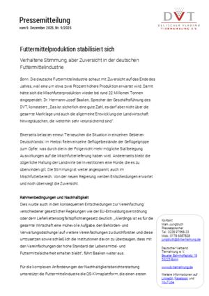 Der Deutsche Verband Tiernahrung e. V. (DVT) vertritt als unabhängiger Wirtschaftsverband die Interessen der Unternehmen, die Futtermittel, Vormischungen und Zusatzstoffe für Nutz- und Heimtiere herstellen, lagern und damit handeln.
