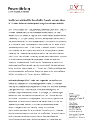 Bonn. Im Kalenderjahr 2024 produzierten deutsche Mischfutterbetriebe rund 21,9 Millionen Tonnen Futter. Das entspricht einem leichten Anstieg um rund 1,1 Prozent (+245.000 Tonnen) im Vergleich zum Vorjahr, wie der Deutsche Verband Tiernahrung e.V. (DVT) am Dienstag auf seiner Jahrespressekonferenz mitteilte. Die Zahlen basieren auf von der Bundesanstalt für Landwirtschaft und Ernährung (BLE) erhobenen Daten. „Der Anstieg ist in erster Linie durch das leichte Plus im Schweinesegment um rund 210.000 Tonnen zu erklären“, sagte DVT-Präsident Cord Schiplage, der jedoch gleichzeitig die starken Rückgänge der Vorjahre in Erinnerung rief. „Dieser leichte Anstieg ist erfreulich. Seit dem Höchststand im Jahr 2020 mit 24,1 Millionen Tonnen zeigt sich ein deutlicher Einschnitt durch die wirtschaftlichen Entwicklungen der vergangenen Jahre in der tierischen Veredlung“. Insbesondere die Entwicklung der Tierbestände sei weiterhin ein eindeutiges Signal für die aktuelle Lage der Landwirtschaft. Der leichte Anstieg bei der Anzahl der Mastschweine um 1,7 Prozent auf 9,7 Millionen dürfe darüber nicht hinwegtäuschen, so Schiplage. Besorgniserregend ist die weiter gefallene Zahl der Milchkühe um 3,4 Prozent auf unter 3,6 Millionen.
